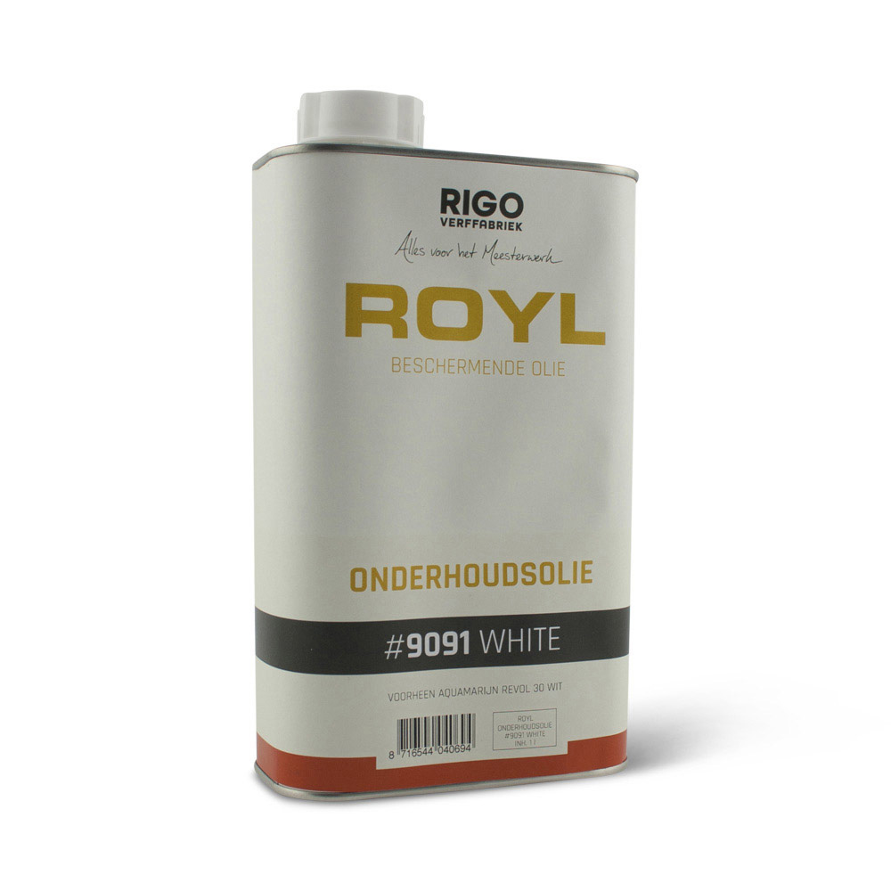 Royl Onderhoudsolie #9090 is een onderhoudsmiddel voor het opfrissen en herstellen van alle geoliede oppervlaktes als parket, houten vloeren, meubelen, tafelbladen en werkbladen. Voorheen heette dit product Aquamarijn Revol. Het is te verkrijgen in een naturele blanke en een witte variant. De te behandelen oppervlaktes dienen eerst wel te worden gereinigd met Royl Intensief Reiniger. Wekelijkse reiniging kunt u doen met Royl Vloerzeep of Royl Milde Reiniger.