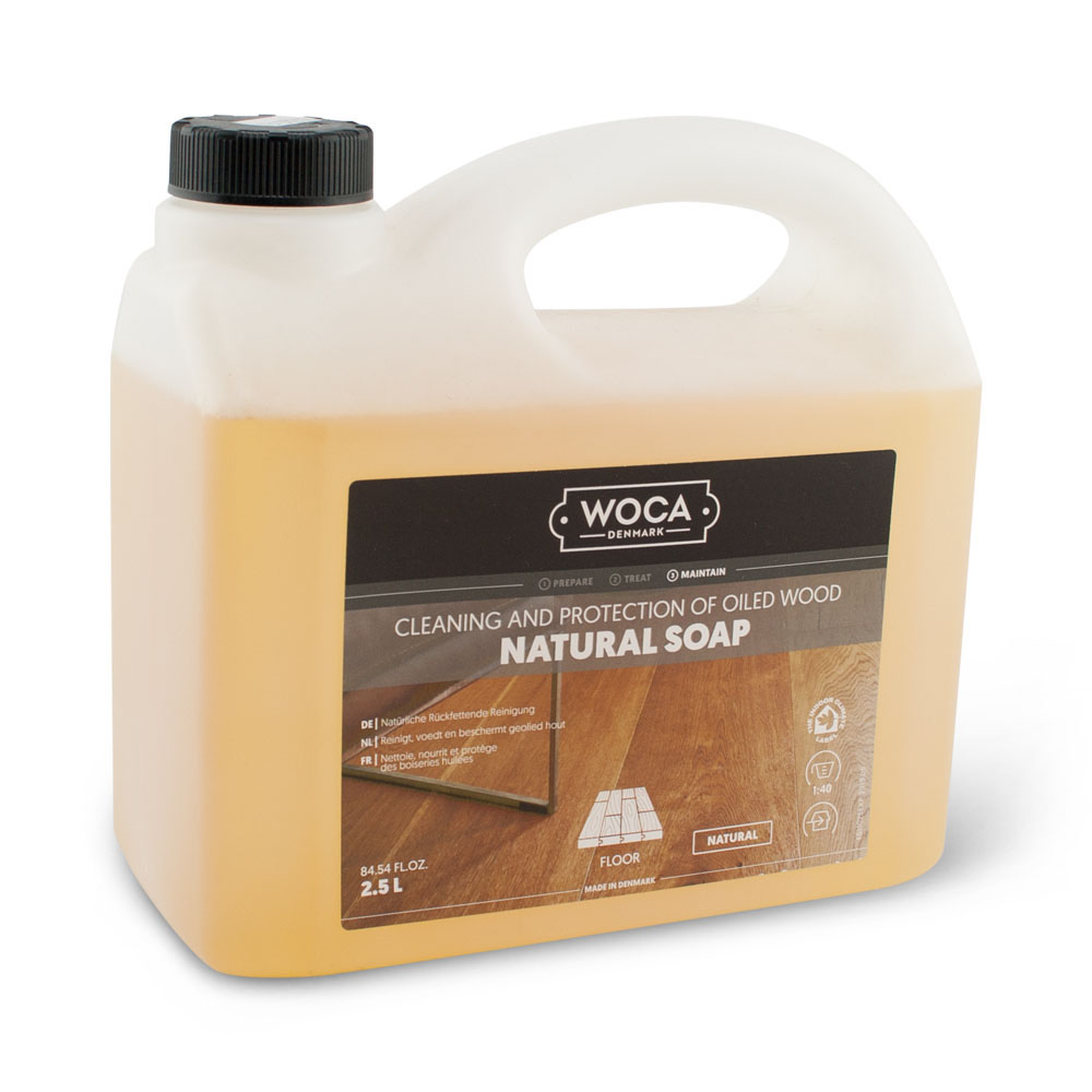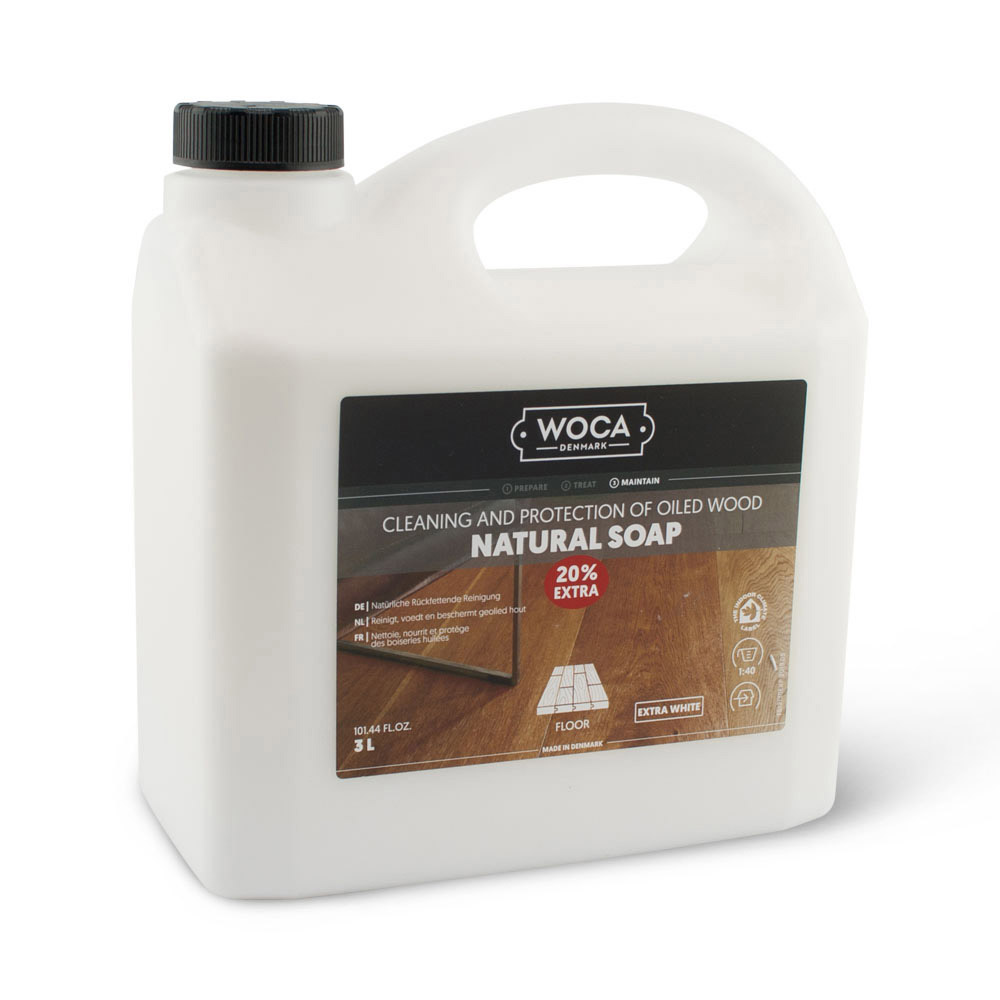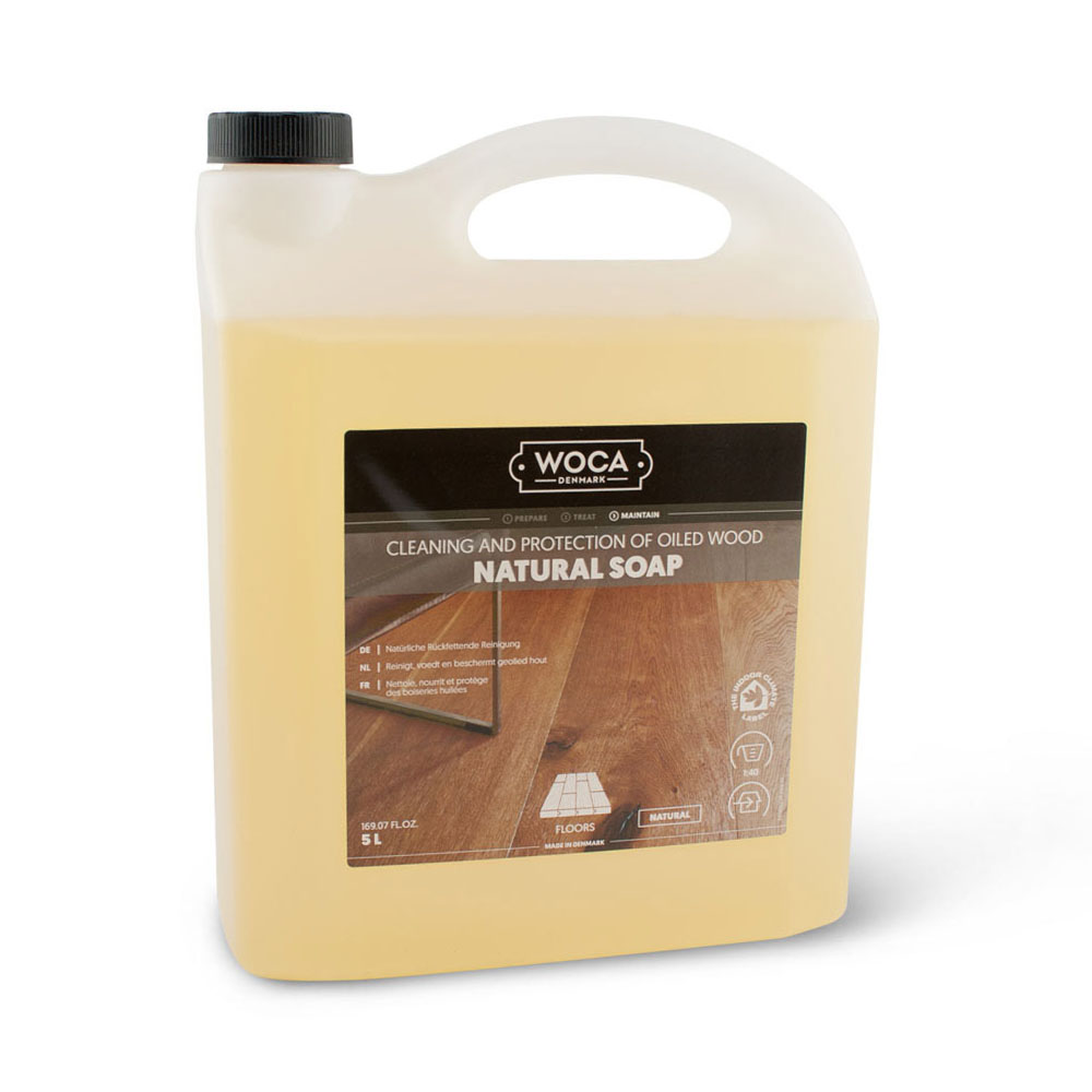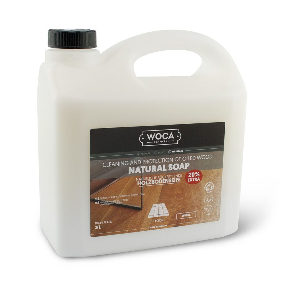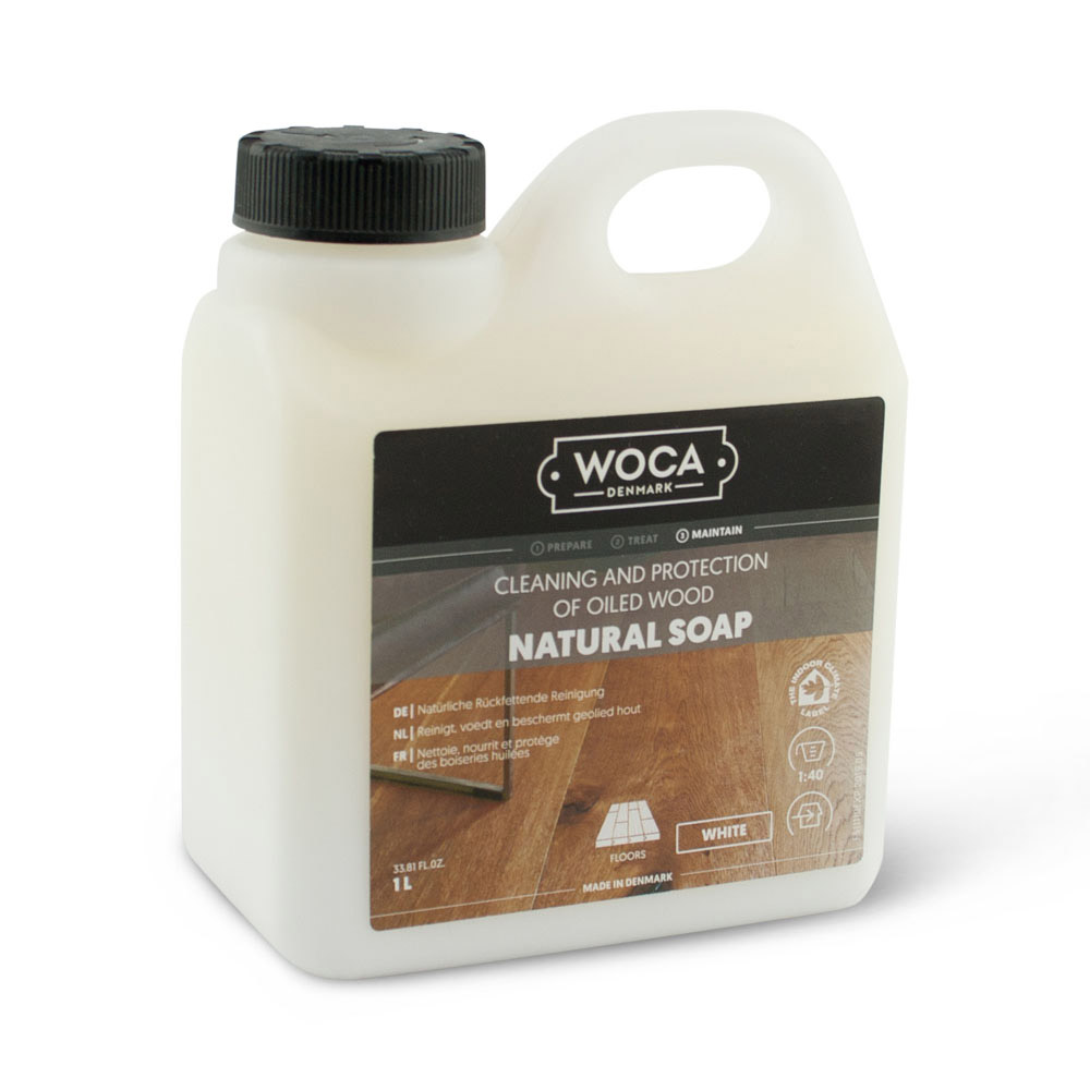 Woca Natuurzeep is een natuurlijke reiniger voor vloeren die behandeld zijn met Woca olie. De zeep reinigt, voedt en beschermt uw vloer. Het laat een zeepfilm achter op uw vloer wat uw vloer water- en vuilbestendig maakt. Het is verkrijgbaar in een naturel, grijze en witte kleur. Woca Natuurzeep reinigt uw vloer en voorziet de vloer weer van een schone nieuwe zeeplaag. Voor periodieke reiniging kunt u Woca Conditioner gebruiken. Jaarlijks onderhoud doet u met Woca Intensiefreiniger en Woca Onderhoudsolie. Ook voor vloeren die alleen maar gezeept zijn of moeten worden kunt u Woca Natuurzeep gebruiken. Tegenwoordig is de Woca Natuurzeep ook te krijgen in een kant en klare sprayflacon, die niet meer verdunt hoeft te worden.